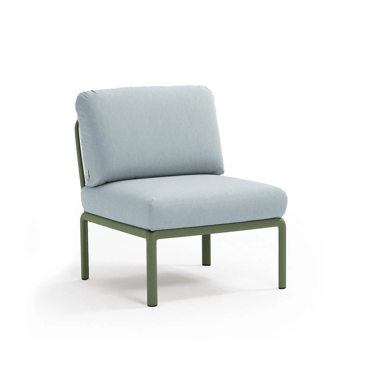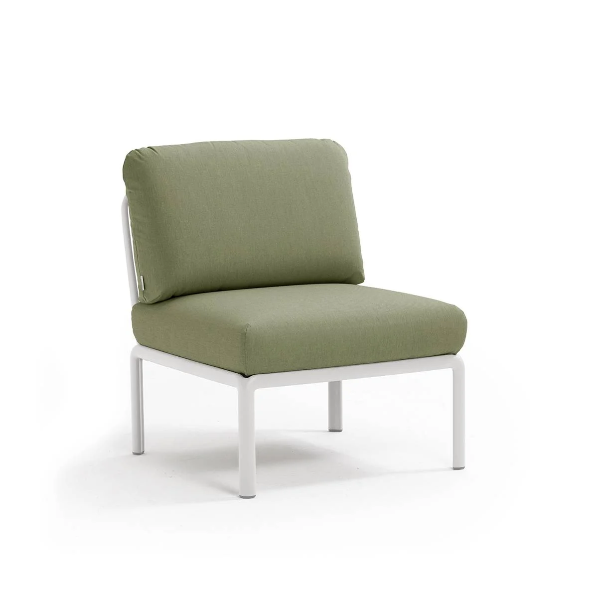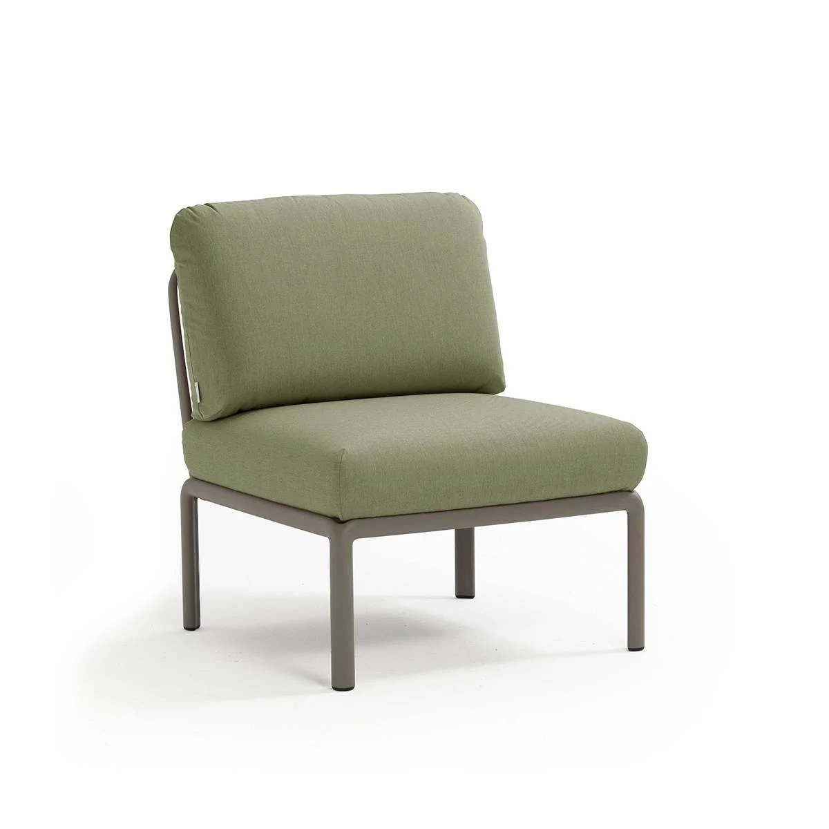 Sillón sin brazos de resina de fibra de vidrio y acolchados. Se puede comprar individualmente o diseñar como elemento central en composiciones más amplias previstas por la colección de sillas modulares Komodo. Sistema modular de asientos que se puede configurar como se desee. Producto de ensamblar. Fabricado en Italia. ESTRUCTURA: polipropileno fiberglass tratado anti-UV y teñido en masa. Respaldo y apoyabrazos acopables a todos los lados del asiento. Desmontable. Efecto mate. Con tapones antideslizantes. Resina reciclable. COJÌNES: Desenfundable/zip. Cuscino Seduta espesor 18 cm, con botones. Cuscino Schienale espesor 22 cm, con ganchos.
