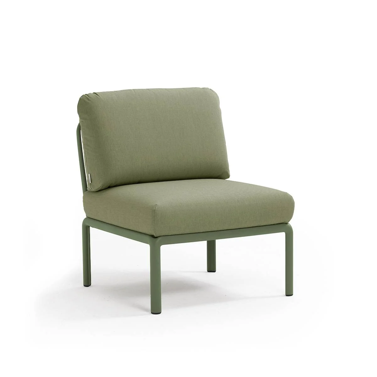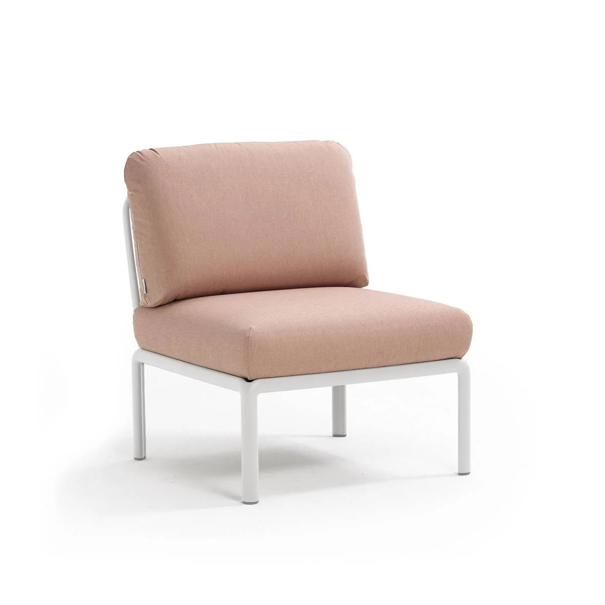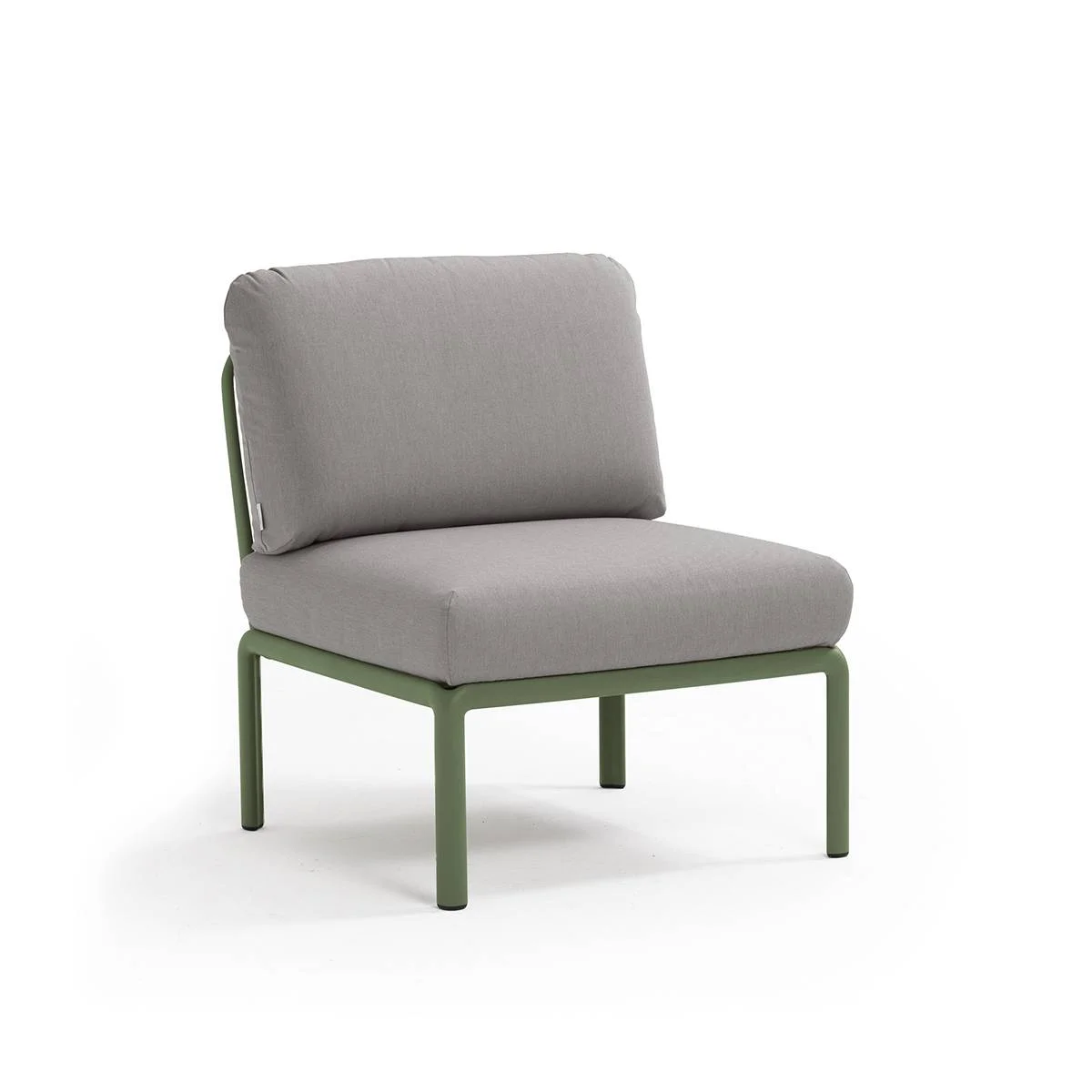 Sillón sin brazos de resina de fibra de vidrio y acolchados. Se puede comprar individualmente o diseñar como elemento central en composiciones más amplias previstas por la colección de sillas modulares Komodo. Sistema modular de asientos que se puede configurar como se desee. Producto de ensamblar. Fabricado en Italia. ESTRUCTURA: polipropileno fiberglass tratado anti-UV y teñido en masa. Respaldo y apoyabrazos acopables a todos los lados del asiento. Desmontable. Efecto mate. Con tapones antideslizantes. Resina reciclable. COJÌNES: Desenfundable/zip. Cuscino Seduta espesor 18 cm, con botones. Cuscino Schienale espesor 22 cm, con ganchos.